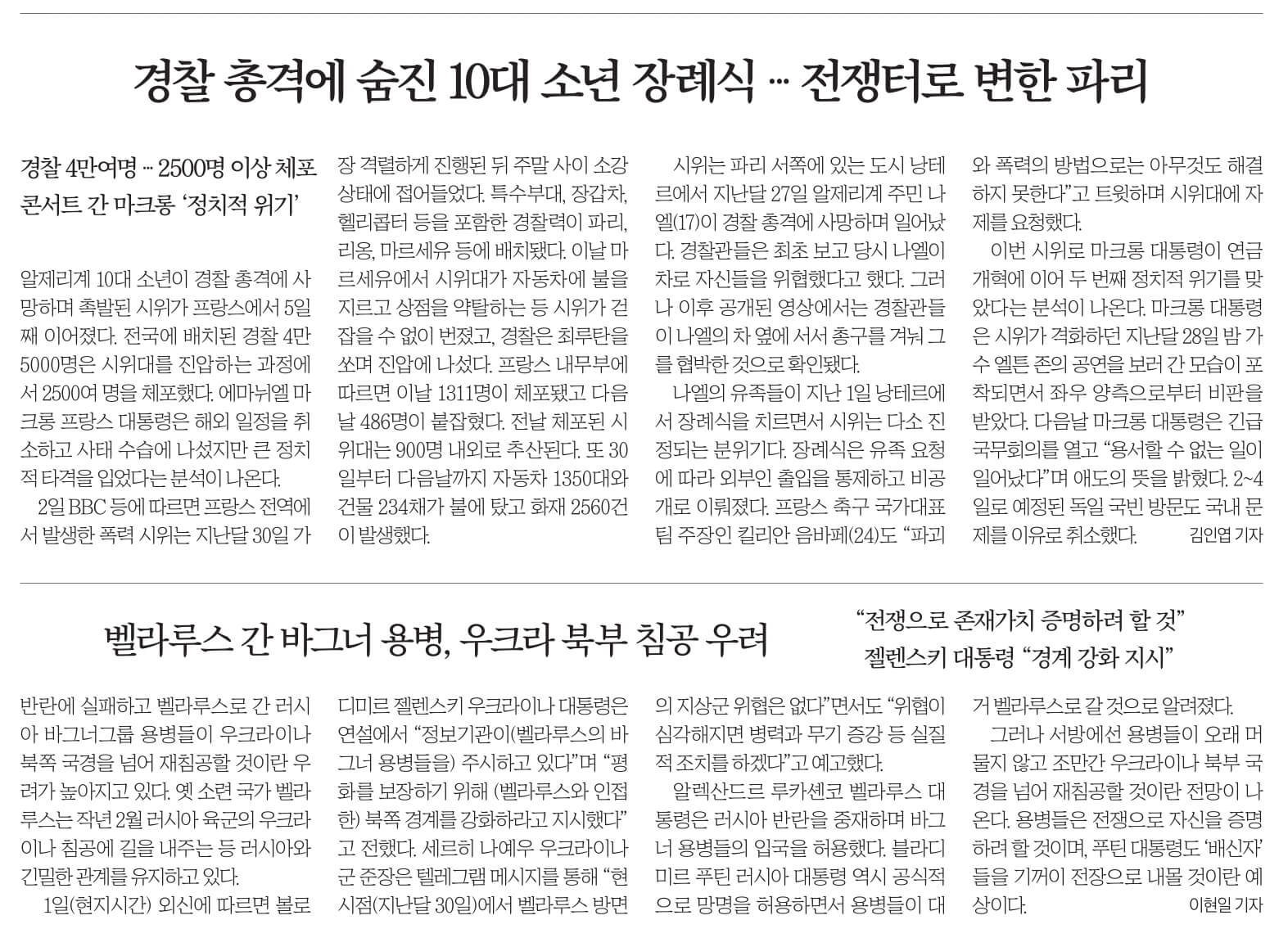 교통 검문을 피해 달아나던 알제리계 17세 소년 나엘이 경찰 총격에 숨진 사건으로 프랑스 전역에서 인종 차별과 경찰의 과잉 진압을 규탄하는 폭력 시위가 닷새째 이어지고 있다.