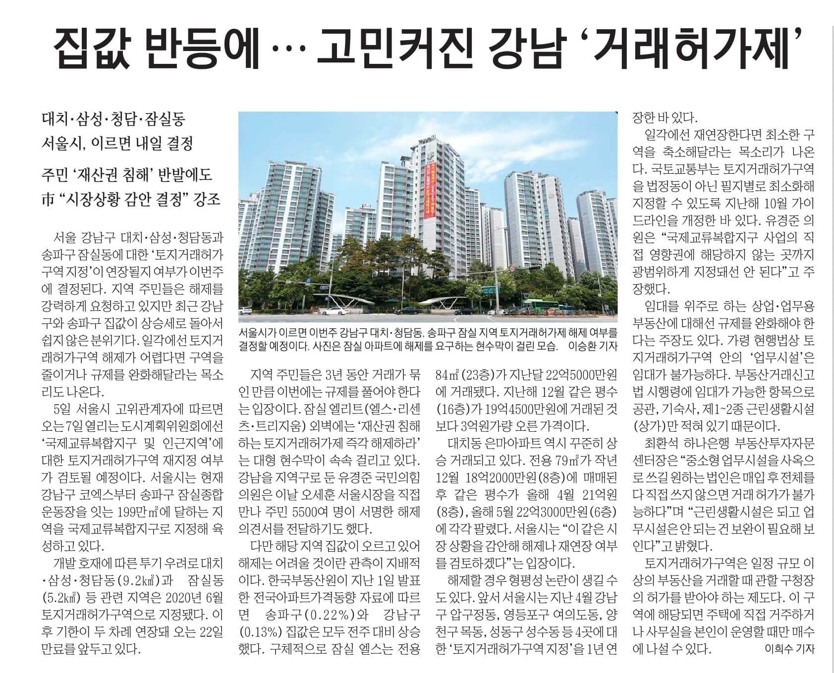 서울 강남구 대치 , 삼성 , 청담동과 송파구 잠실동에 대한 '토지거래허가구역 지정'이 연장될지 여부가 이번주에 결정된다. 지역 주민들은 해제를 강력하게 요청하고 있지만 최근 강남구와 송파구 집값이 상승세로 돌아서 쉽지 않은 분위기다.