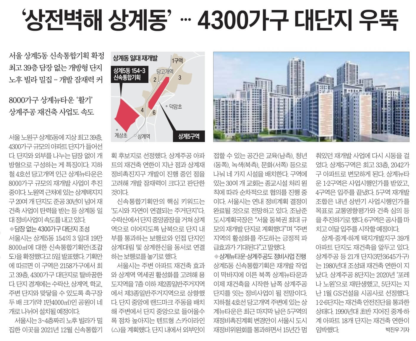 서울 노원구 상계5동에 지상 최고 39층, 4300가구 규모의 아파트 단지가 들어선다. 지하철 4호선 당고개역 인근 상계뉴타운은 8000가구 규모의 재개발 사업이 추진 중이다. 노원역 근처에 있는 상계택지지구 20여 개 단지도 준공 30년이 넘어 재건축 사업이 탄력을 받는 등 상계동 일대 정비사업이 속도를 내고 있다.