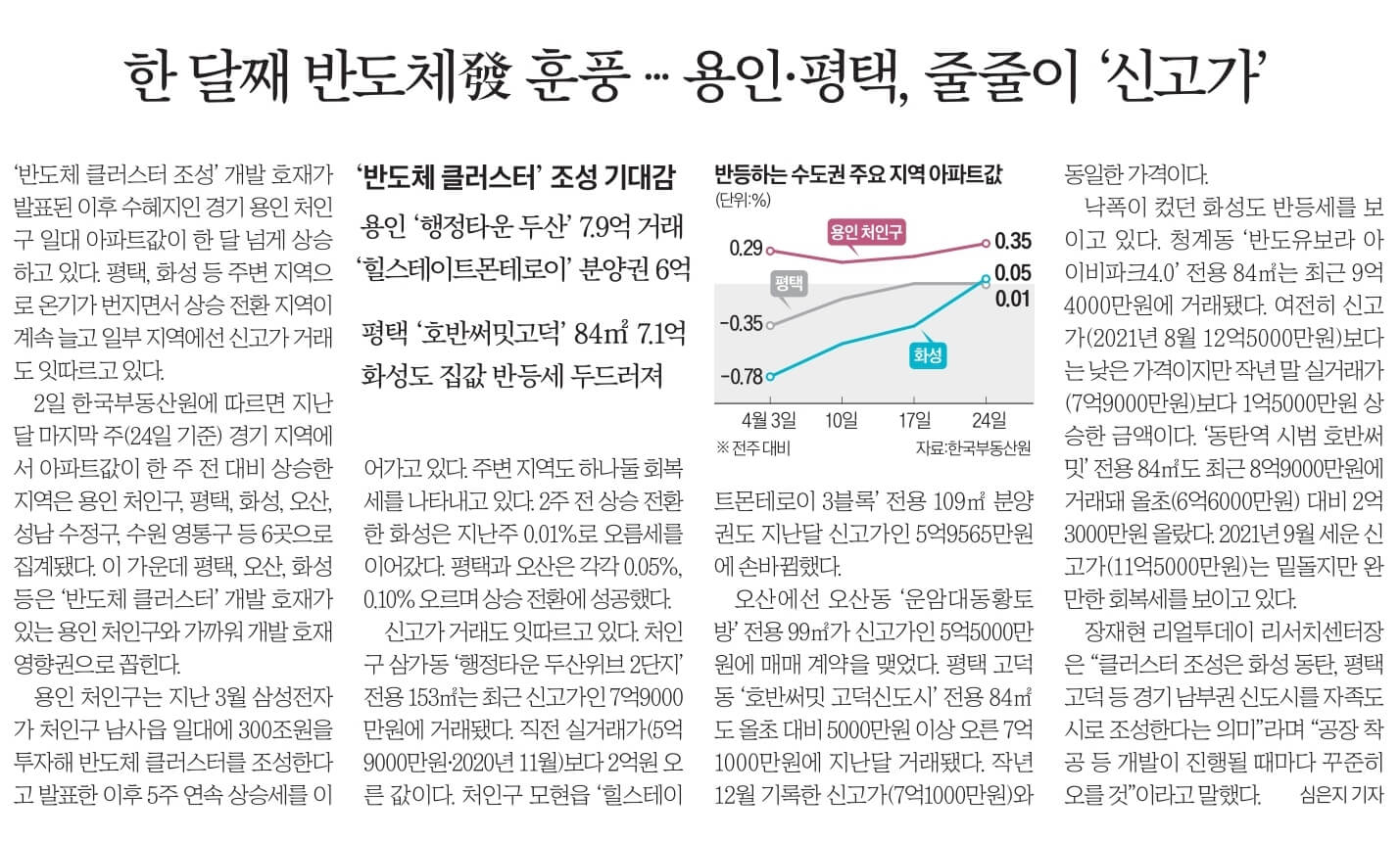 용인 처인구는 지난 3월 삼성전자가 처인구 남사읍 일대에 300조원을 투자해 반도체 클러스터를 조성한다고 발표한 이후 5주 연속 상승세를 이어가고 있다. 낙폭이 컸던 화성도 반등세를 보이고 있다.