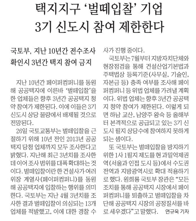 ☞"벌떼 입찰 원천봉쇄"...국토부, 10년 전까지 전수조사...호반건설, 공공택지 낙찰받으려 협력사까지 동원...공정위, 부당 거래 호반건설에 과징금 608억 원...공공택지 추첨분양에 계열사들 동원 '벌떼 입찰'...소수 건설사, 공공택지 독차지하기 위한 편법
