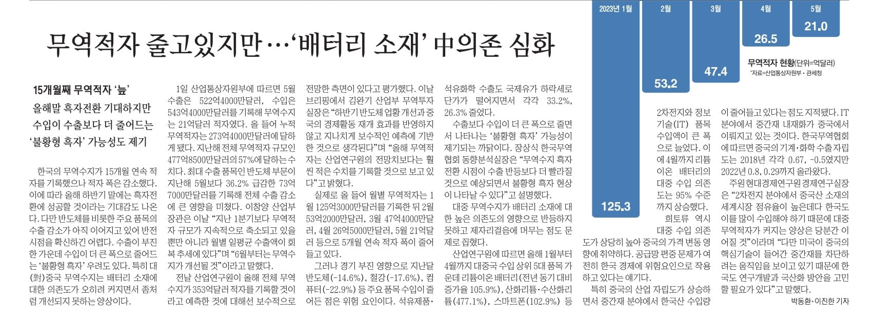 5. 한국의 무역수지가 15개월 연속 적자를 기록했으나 무역수지 적자 폭은 감소. 이에 따라 올해 하반기 말에는 흑자전환에 성공할 것이라는 기대감도 나와.다만 반도체를 비롯한 주요 품목들의 수출 감소가 아직 이어지고 있어 반전 시점을 확신 하긴 어려워. 수출이 부진한 가운데 수입이 더 큰 폭으로 줄어드는 불황형 흑자 우려도 있어. 특히 대(對)중국 무역수지는 배터리 소재에 대한 높은 의존도가 오히려 커지면서 좀처럼 개선되지 못하는 양상.