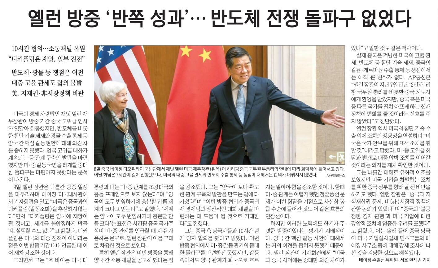 5. 미국의 경제사령탑인 재닛 옐런 재무장관이 방중기간 중국 고위급 인사들과 잇달아 회동했지만 반도체 등 첨단기술 제재와 광물수출 통제 문제 등 양국간 핵심 갈등 현안에 대해 의견차를 좁히지 못했음. 미중 갈등 국면에서 중대한 돌파구가 마련되지는 못했지만 양국 고위급 대화가 계속 이어지면서 양국 관계가 점차 안정적인 흐름으로 이어질 수 있다는 분석도 나옴.