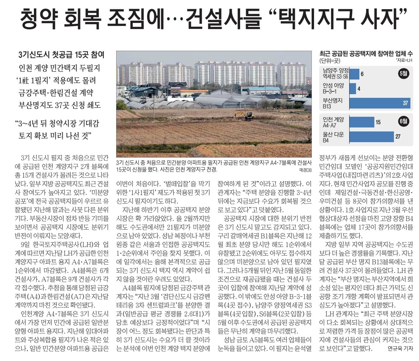 ☞청약 회복 조짐에 ... 건설사들 "택지지구 사자"