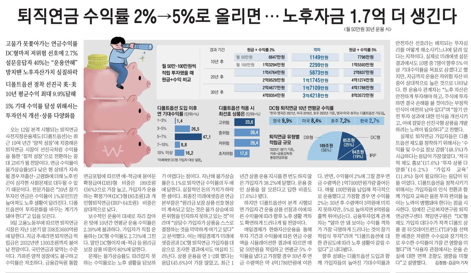 3. 퇴직연금 사전지정운용제도(디폴트옵션)가 12일 정식 시행되면서 장기 수익률을 높이기 위한 연금자산의 대이동이 본격화될 전망. 현재 2%대에 머물고 있는 퇴직연금 수익률을 높이려면 예 , 적금에 묶인 돈을 펀드 등 투자상품으로 대거 옮길 수밖에 없기 때문. 9일 매일경제신문이 미래에셋증권 확정기여형(DC) 퇴직연금 가입자 210명에 직접 조사한 결과 10명 중 7명은 디폴트 옵션 도입 이후 연금 기대수익률을 5% 이상으로 잡고 있다고 답했음