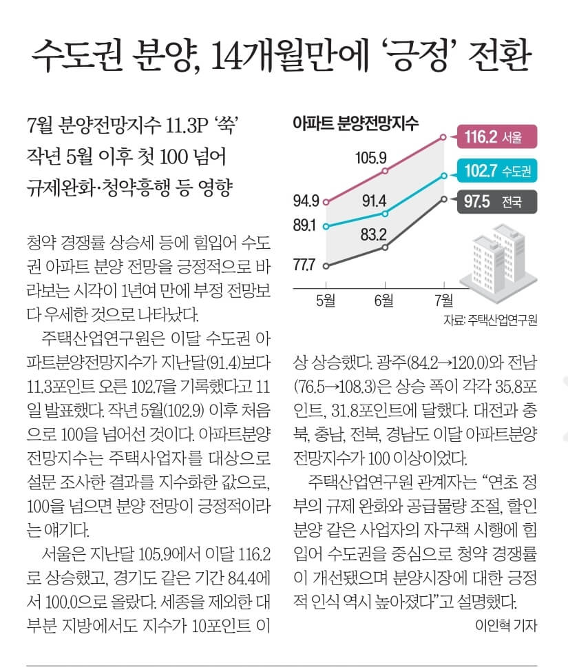 ☞7월 수도권 아파트 분양전망 '긍정적' ... 지방 미분양 우려 여전...기준금리 인상과 이에 따른 금융비용 증가로 국내 부동산 시장 침체...분양가 상한제 폐지 등 각종 규제완화책 시행하면서 아파트 분양전망 먹구름이 소폭상쇄