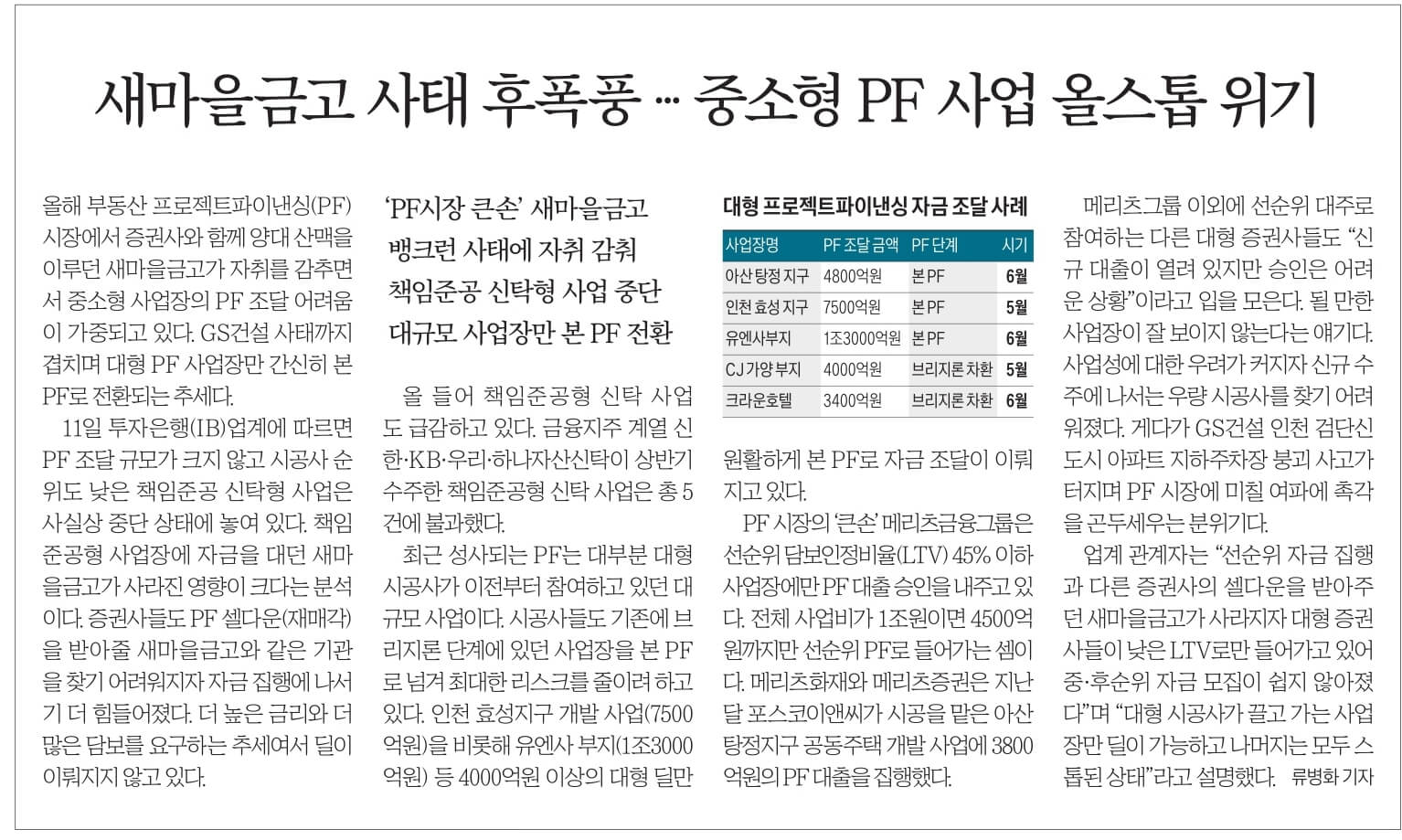 ☞새마을금고 사태 후폭풍 ... 중소형 PF 사업 올스톱 위기