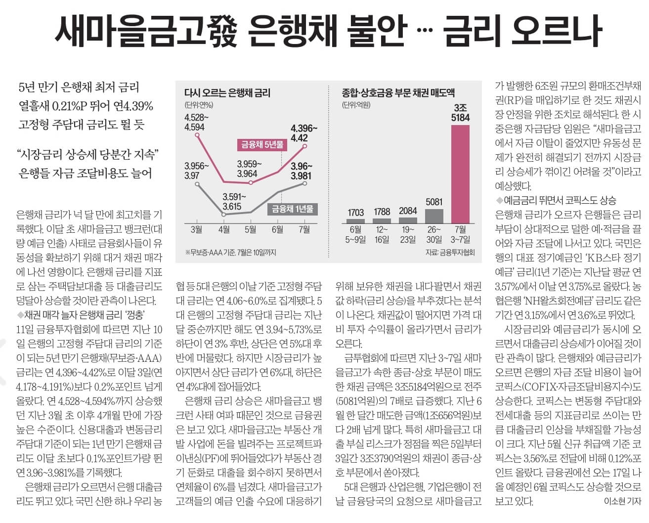 3. 다시 오르는 예금 금리 ... 대출 금리도 따라 오를까 영끌족 긴장. 최근 정기에금 금리 4%대로 올린 은행들 속속. SC제일, Sh수협 4.2%... 대출금리 6% 다시 넘을지 촉각.(헤럴드경제)