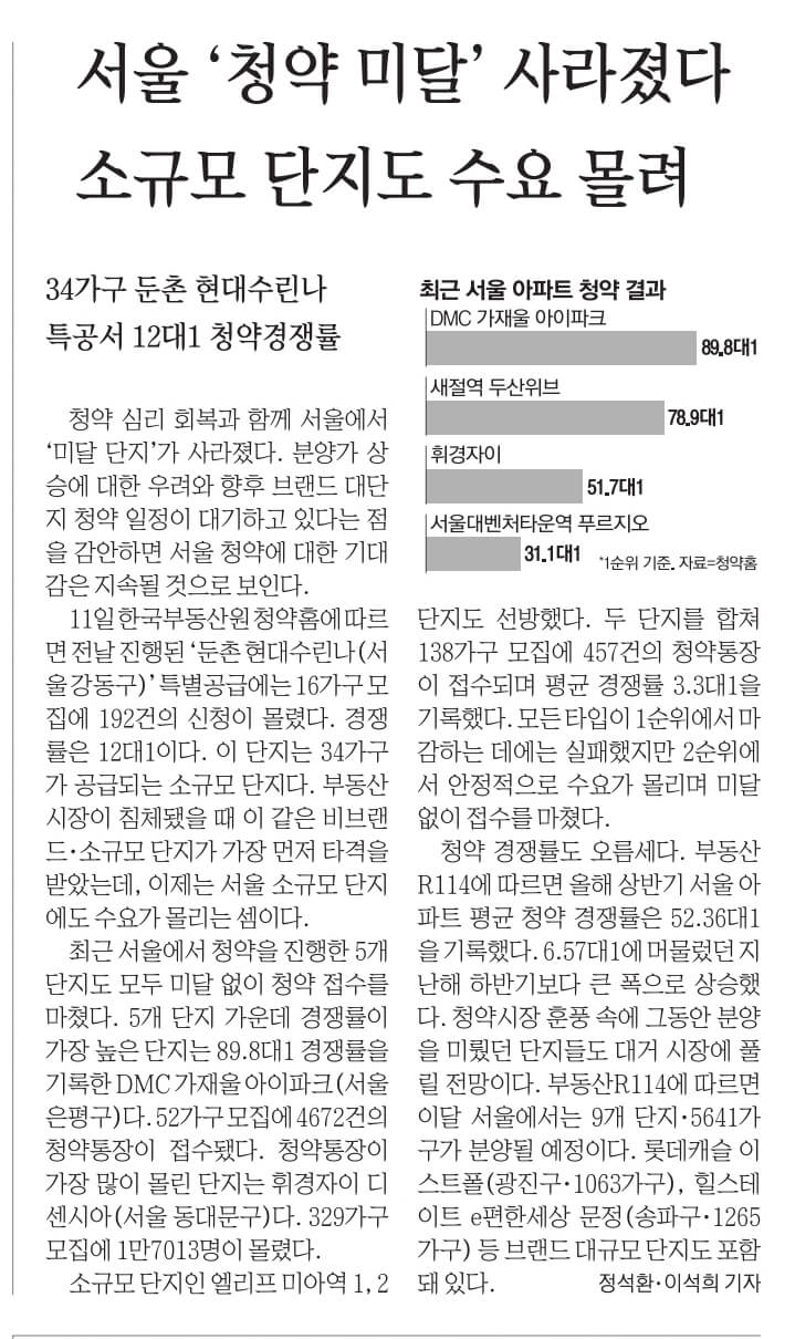 ☞서울 '청약 미달' 사라졌다 소규모 단지도 수요 몰려