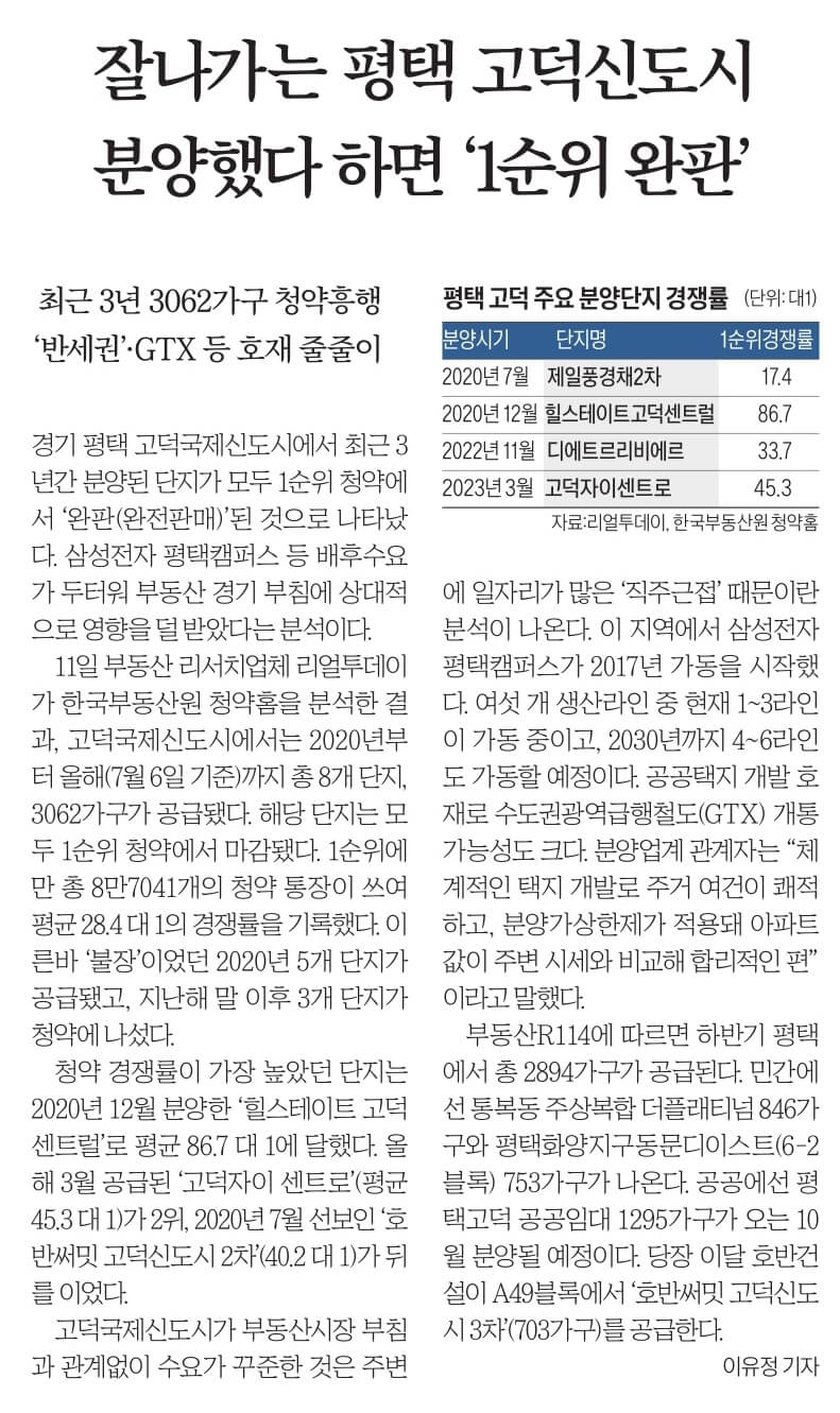 경기 평택 고덕국제신도시에서 최근 3년간 분양된 단지가 모두 1순위 청약에서 완판(완전판매) 된 것으로 나타났다. 삼성전자 평택캠퍼스 등 배후수요가 두터워 부동산 경기 부침에 상대적으로 영향을 덜 받았다는 분석이다.