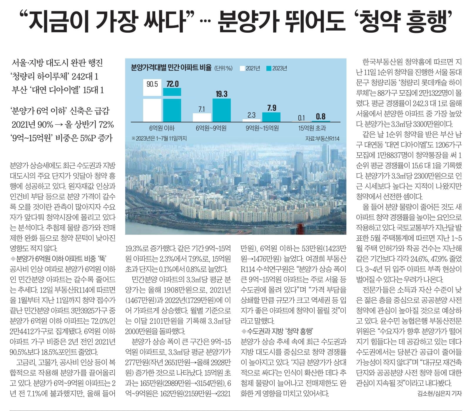 ☞ 2만명 몰린 청량리 ... 하반기 청약시장 청신호 ...'롯데캐슬하이루체' 1순위 88가구 242 대 1...전용 59㎡ 분양가 9억 달해 ... 320 대 1 기록...분양가 상승하자 입지 좋은 곳에 수요 몰려..."청약 앞둔 이문휘경뉴타운 흥행 무난" 전망