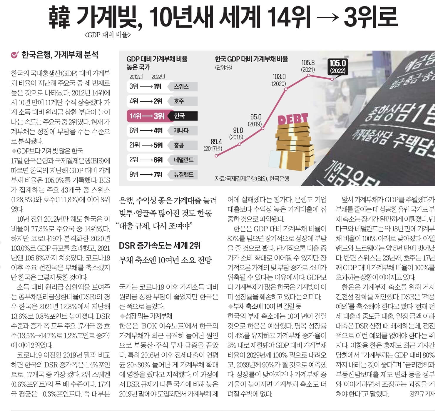4. 가파른 기준금리 인상 여파로 한국의 빚 상환 부담이 전 세계 주요국 중 두 번째로 큰 것으로 나타나. 부동산 경기 연착륙을 위한 대출 규제 완화가 예고된 가운데 가계대출이 최근 다시 늘어나면서 금융 불안을 경계해야 한다는 목소리도 커지고 있음. 17일 국제결제은행(BIS)에 따르면 지난해 말 기준 한국 가계부문의 총부채원리금상환비율(DSR)은 14.3%로 조사됨.