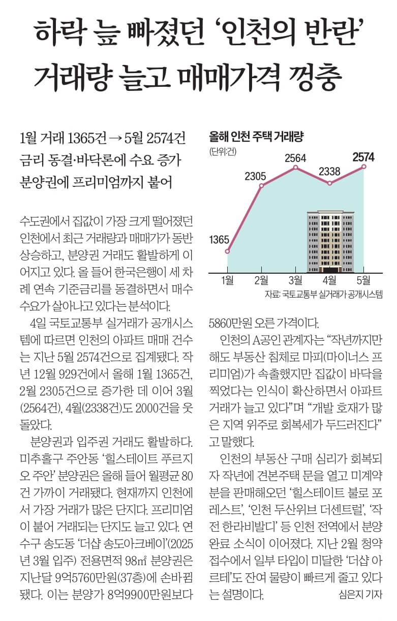인천에서 최근 거래량과 매매가가 동반 상승하고, 분양권 거래도 활발하게 이어지고 있다. 올 들어 한국은행이 세 차례 연속 기준금리를 동결하면서 매수 수요가 살아나고 있다는 분석이다.