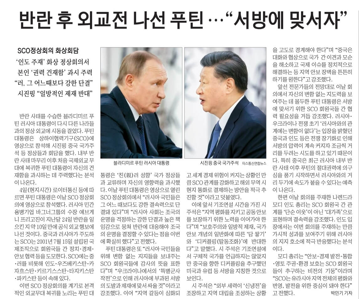 반란 사태를 수습한 블라디미르 푸틴 러시아 대통령이 다시 다른 나라와의 정상 외교에 시동을 걸었다. 내부 반란 사태가 마무리된 후 처음 국제 외교 무대에 복귀한 푸틴 대통령이 자신의 건재함을 과시하는 데 주력할 것이라는 분석이 나온다.