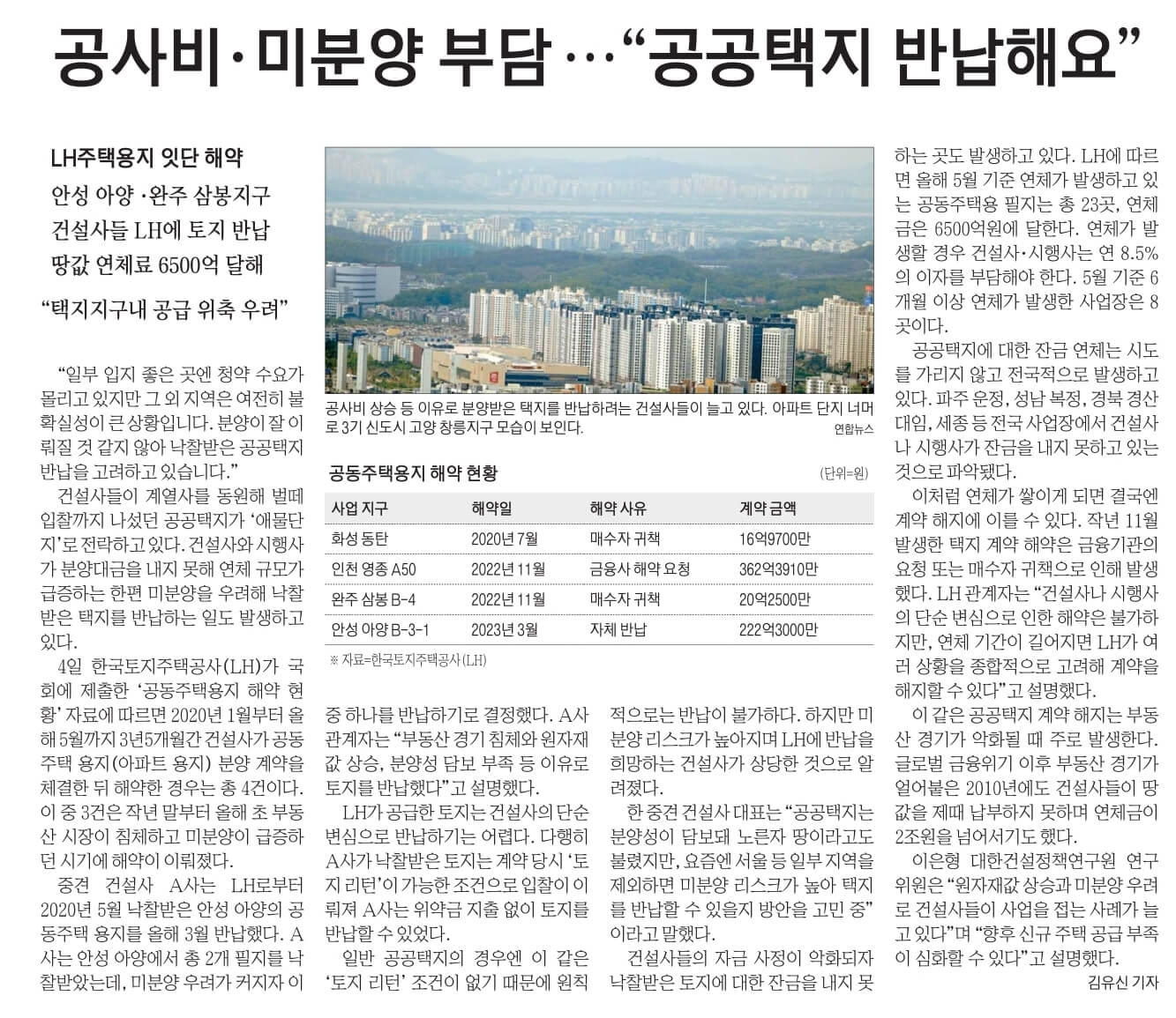 ☞ 공사비 , 미분양 부담 ... "공공택지 반납해요"...LH주택용지 잇단 해약...안성 아양 , 완주 삼봉지구...건설사들 LH에 토지 반납...땅값 연체료 6500억 달해..."택지지구내 공급 위축 우려"