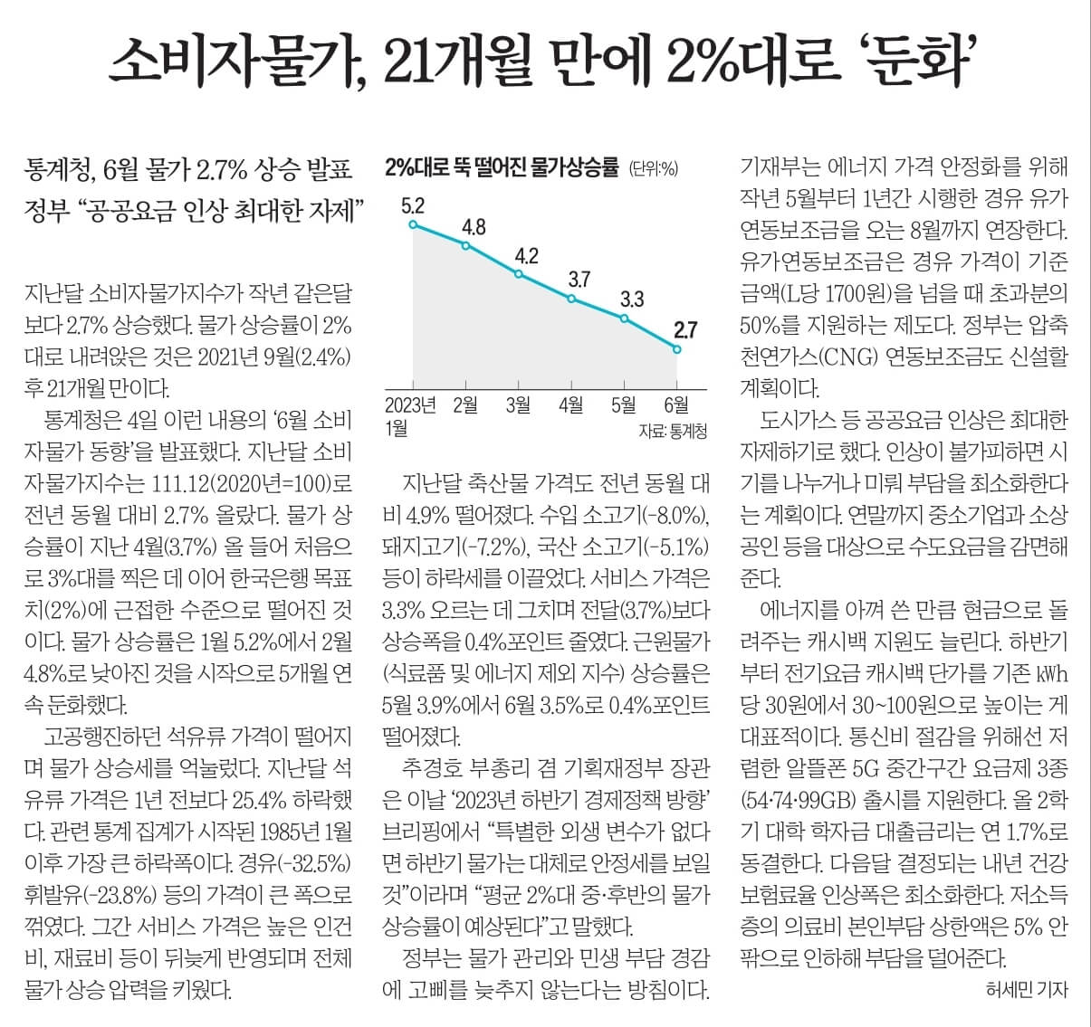 4. 지난달 국내 소비자물가 상승률이 21개월 만에 2%대로 둔화됨. 통계청에 따르면 6월 소비자물가지수는 111.12로 작년 같은 달보다 2.7% 올랐음. 소비자물가 상승률은 올 1월에 5.2%까지 치솟았다가 지속적으로 하락하고 있음.