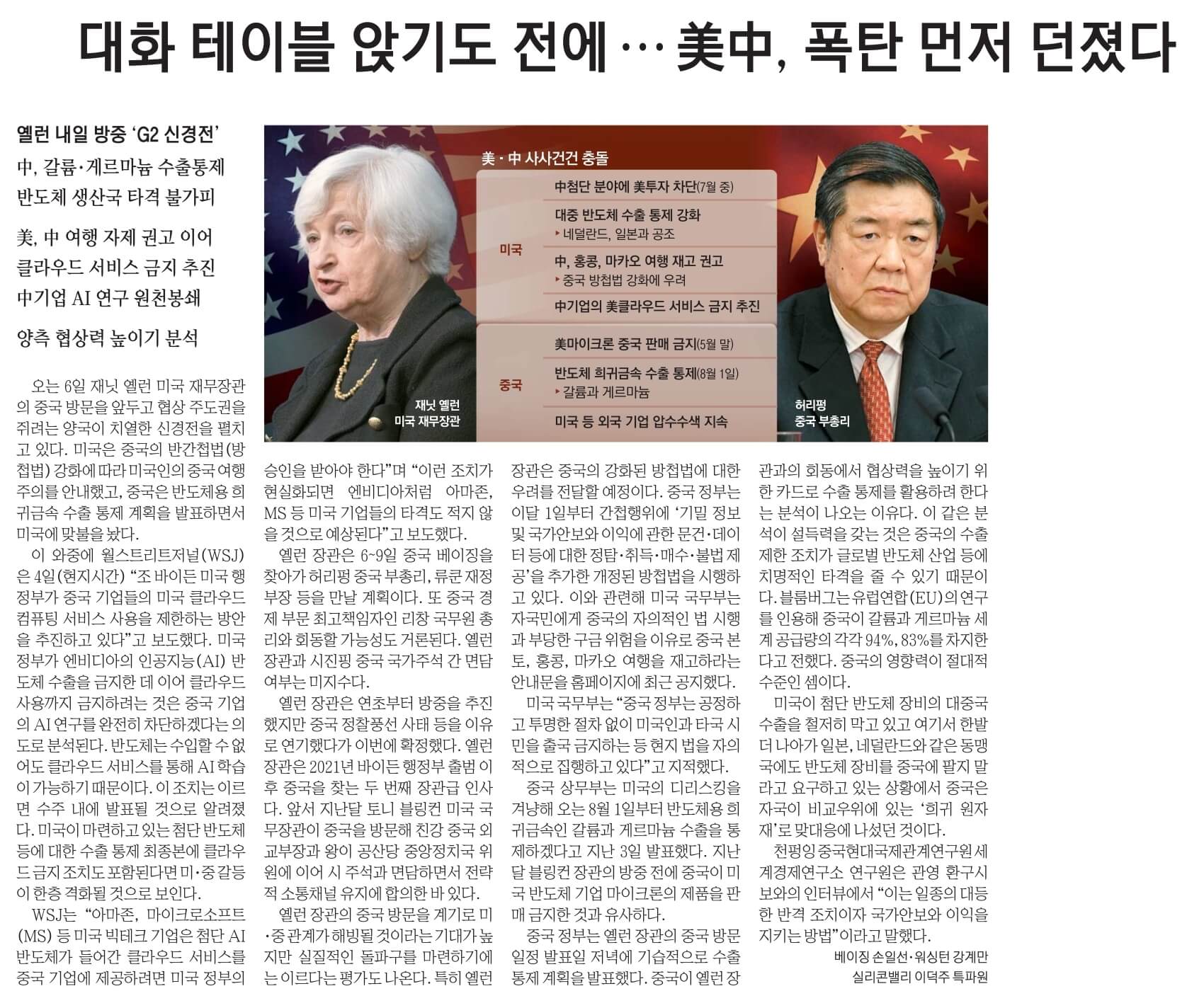 6. 오는 6일 재닛 옐런 미국 재무장관의 중국 방문을 앞두고 협상 주도권을 쥐기 위한 양국간에 치열한 신경전이 펼쳐짐. 월스트리트저널은 바이든 행정부가 중국 기업들의 미국 클라우드 컴퓨팅 서비스 사용을 제한하는 방안을 검토하고 있다고 보도했음. 이는 앞서 중국이 반도체에 사용되는 중요 금속의 미국 수출을 금지시키자 맞불놓은 것.
