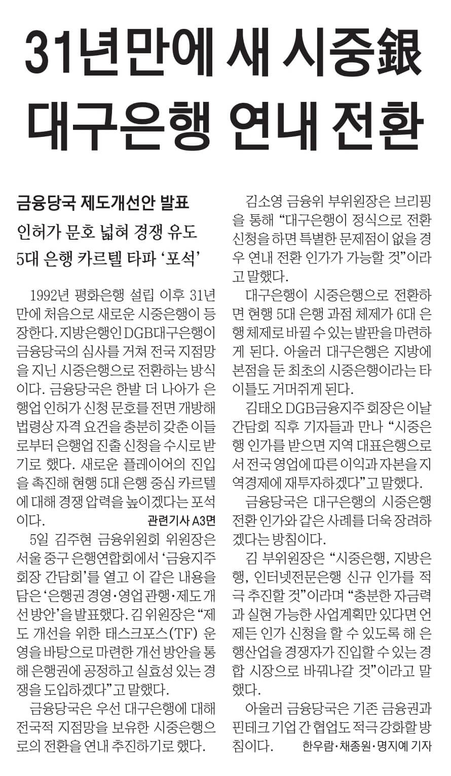 1. 1992년 평화은행 설립 이후 31년만에 처음으로 새로운 시중은행이 등장할 전망. 지방은행인 대구은행이 금융당국 심사를 거쳐 전국 지점망을 지닌 시중은행으로 전환될 예정. 5일 김주현 금융위원장은 서울 은행연합회에서 금융지주회장 간담회 를 열고 이같은 내용을 담은 은행권 경영 , 영업 관행 , 제도 개선방안 을 발표. 금융당국은 은행업 인허가 신청 문호를 전면 개방해 법령상 자격 요건을 충분히 갖춘 이들로부터 은행업 진출 신청을 수시로 받기로.