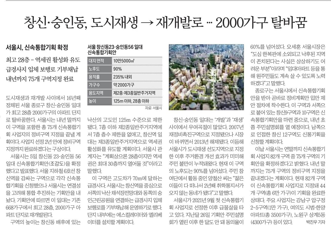 경사진 구릉지라 이동이 불편하다는 문제를 해결하기 위해 지하철 6호선 창신역부터 채석장, 숭인근린공원을 연결하는 입체보행로도 만들 계획이다. 서울시장이 바뀔 때마다 상당한 우여곡절을 겪어온 창신 , 숭인동 일대가 이번엔 재개발될 수 있을지 주목된다.