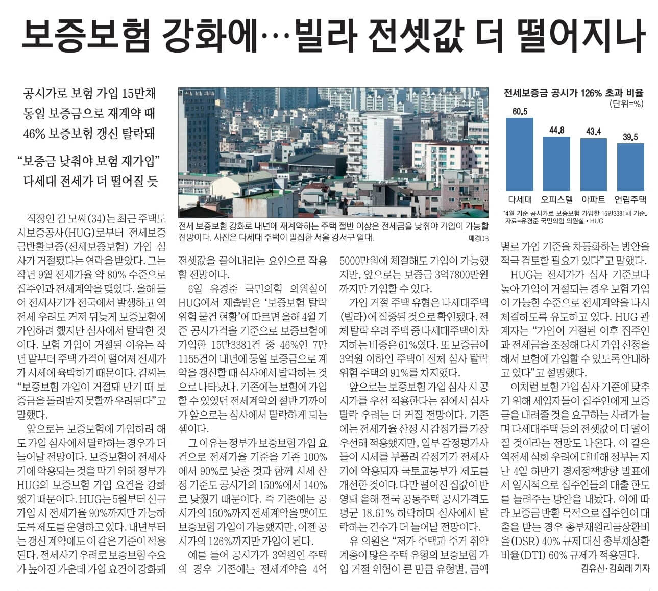 ☞ 보증보험 강화에 ... 빌라 전셋값 더 떨어지나...공시가로 보험 가입 15만채...동일 보증금으로 재계약 때 46% 보증보험 갱신 탈락돼..."보증금 낮춰야 보험 재가입"...다세대 전세가 더 떨어질 듯