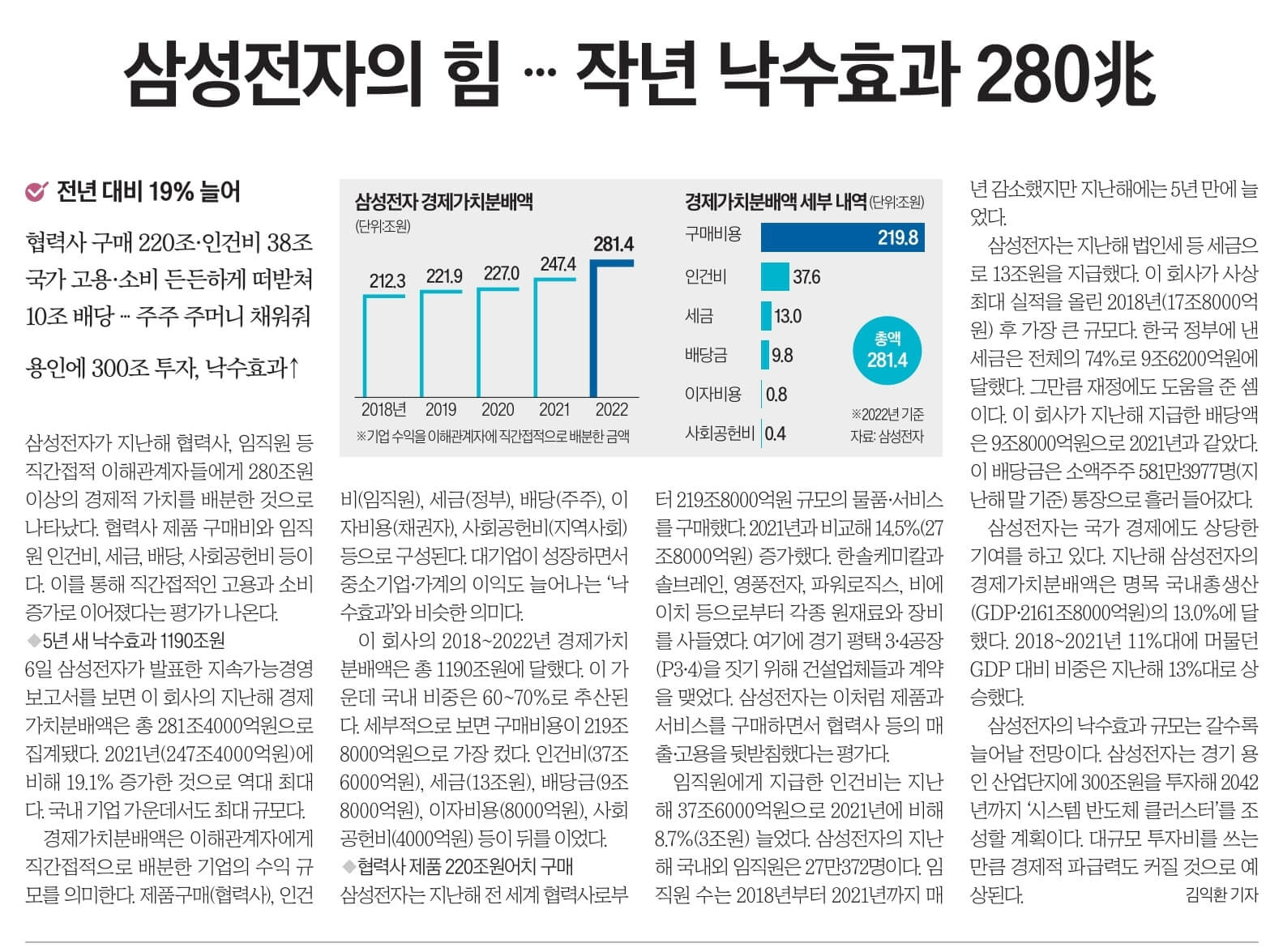 ☞ 삼성전자의 힘 ... 작년 낙수효과 280兆...전년 대비 19% 늘어...협력사 구매 220조 , 인건비 38조...국가 고용 , 소비 든든하게 떠받쳐...10조 배당 ... 주주 주머니 채워줘...용인에 300조 투자, 낙수효과 상승