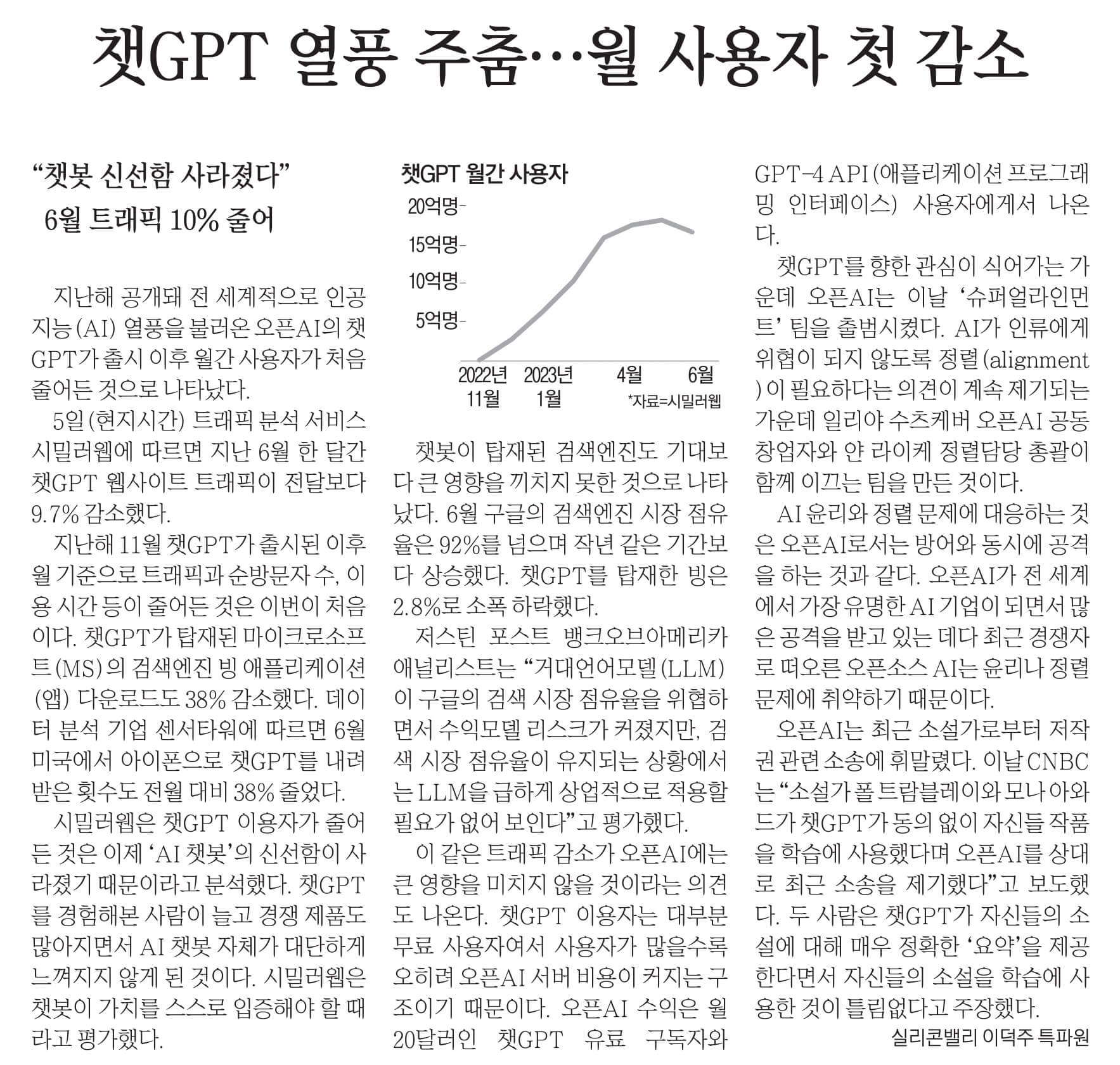 6. 챗GPT 벌써 시들? 이용자수 감소 ... 출시 두 달만에 이용자 1억명 돌파했지만 6월 들어 웹 , 모바일 트래픽 9.7% 감소. 참신성 사라지고 정확성에 대한 실망, 방학 등 영향도.(세계)