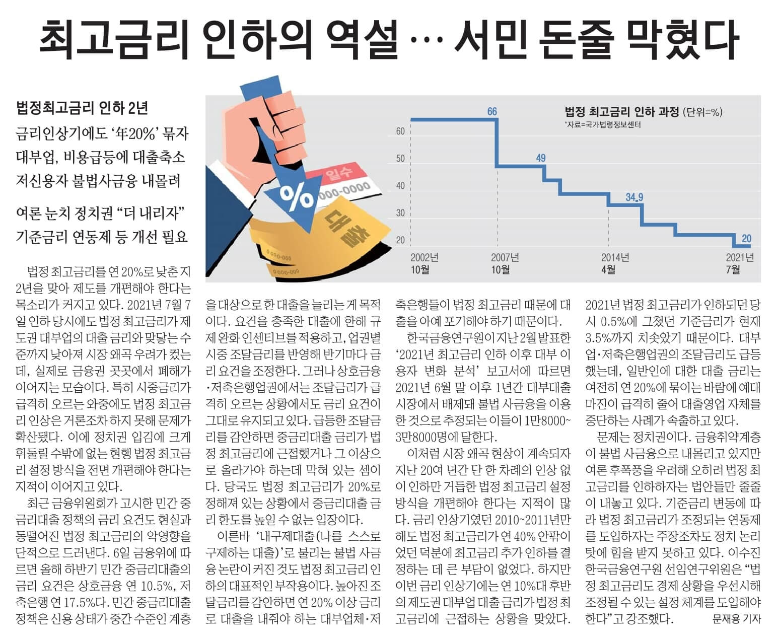 ☞ 최고금리 인하의 역설 ... 서민 돈줄 막혔다...법정최고금리 인하 2년...금리인상기에도 '年20%' 묶자 대부업, 비용급등에 대출축소, 저신용자 불법사금융 내몰려...여론 눈치 정치권 "더 내리자"...기준금리 연동제 등 개선 필요