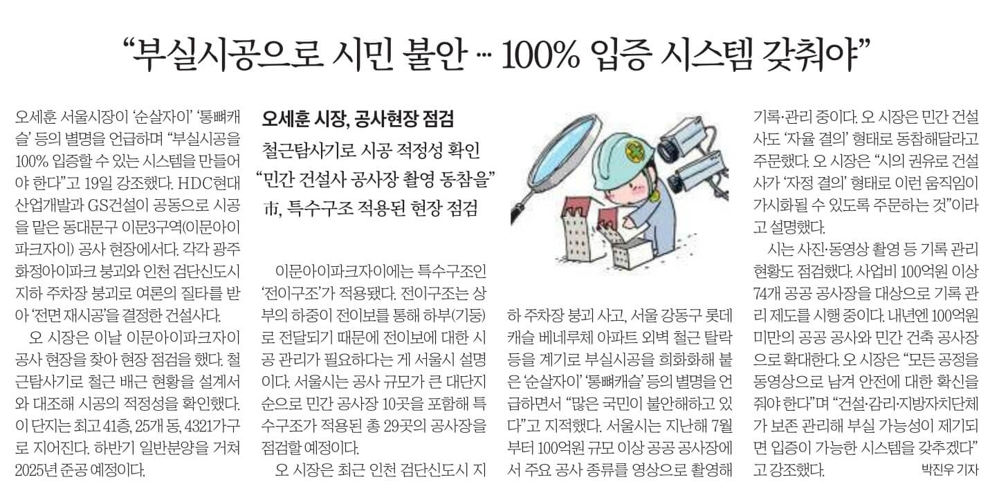 ☞ "부실시공으로 시민 불안 ... 100% 입증 시스템 갖춰야"...오세훈 시장, 공사현장 점검...철근탐사기로 시공 적정성 확인..."민간 건설사 공사장 촬영 동참을"...市, 특수구조 적용된 현장 점검