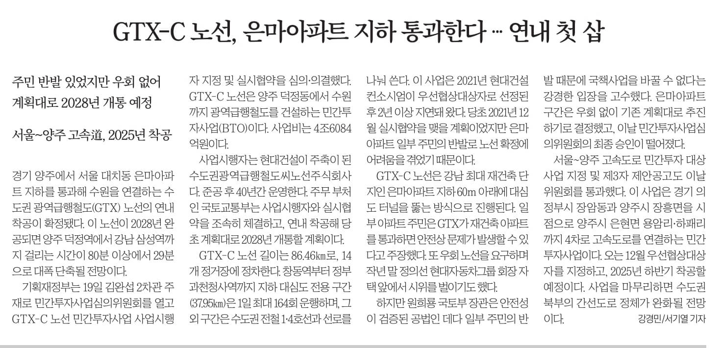 4. 경기 양주시 덕정에서 수원을 잇는 수도권 광역급행철도(GTX)-C노선의 공사가 올해 첫삽을 뜨게 됨. GTX-C노선은 총 86.46km 길이로 경기도 양주시 덕정역부터 수원역까지 총 14개 정거장에 정차함. 오는 2028년 GTX-C노선이 완공되면 덕정역에서 수원역까지 현재 지하철로 2시간30분 정도 걸리는 시간이 1시간 이내로 대폭 줄어들게 됨.