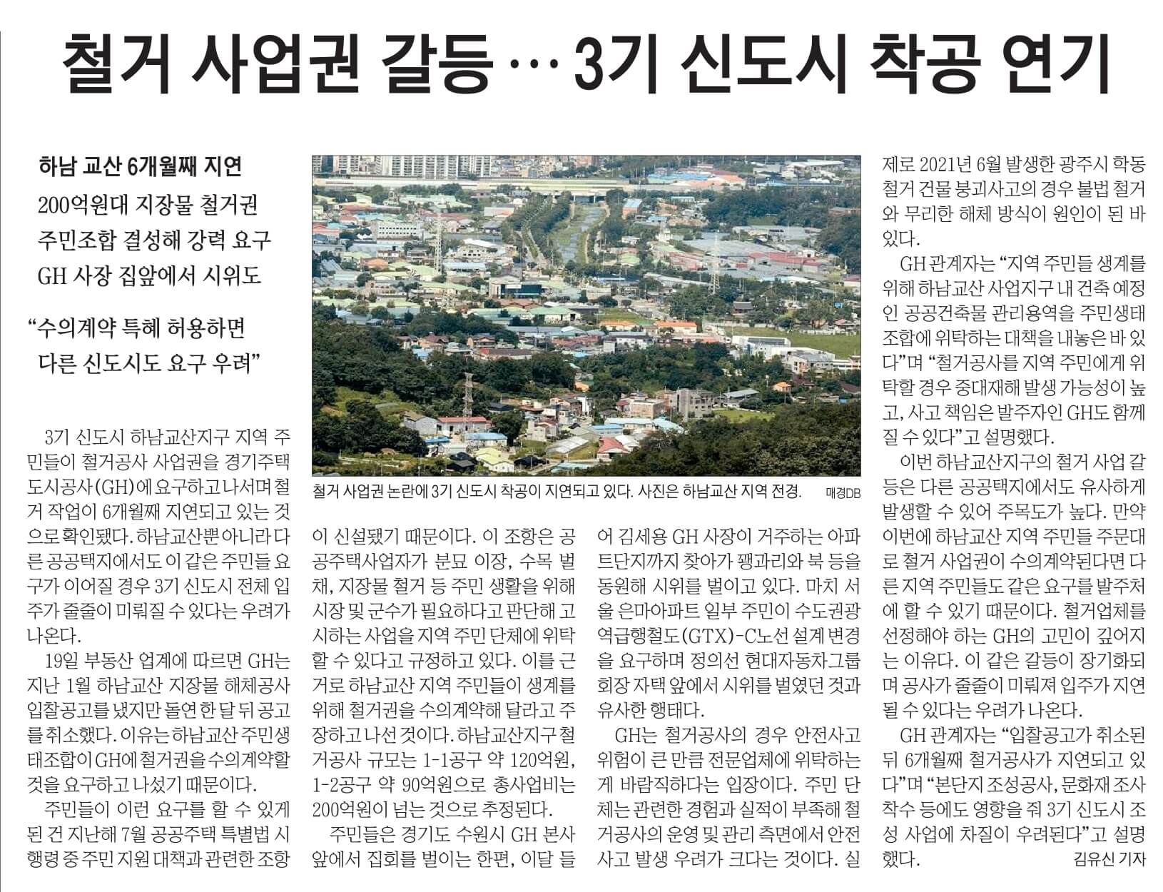 ☞ 새집 언제 들어가나요?...첫삽 못뜬 3기 신도시 200억대 철거권 논란 왜...하남 교산 6개월째 지연...200억원대 지장물 철거권, 일부 주민 GH에 강력 요구...GH 사장 집앞에서 시위도...수의계약 특혜 허용하면 다른 3기 신도시도 요구 우려
