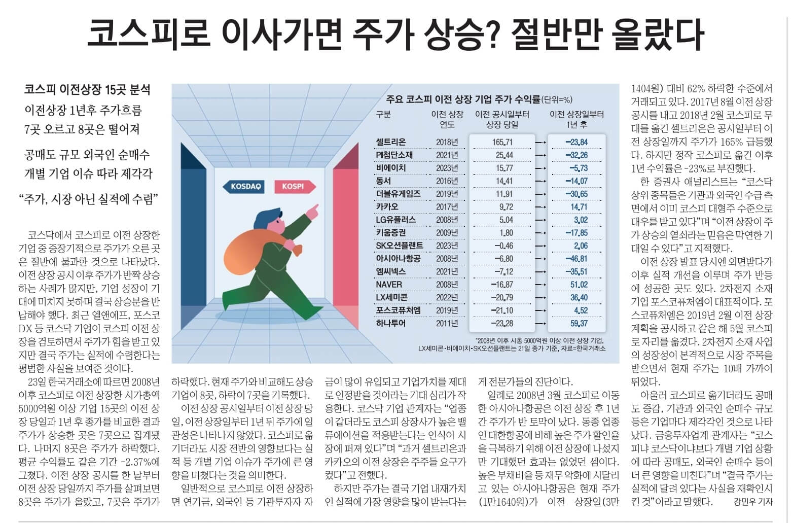 코스닥에서 코스피로 이전 상장한 기업 중 중장기적으로 주가가 오른 곳은 절반에 불과한 것으로 나타났다. 이전 상장 공시 이후 주가가 반짝 상승하는 사례가 많지만, 기업 성장이 기대에 미치지 못하며 결국 상승분을 반납해야 했다.