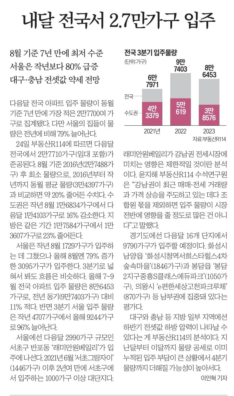 다음달 전국 아파트 입주 물량이 동월 기준 7년 만에 가장 적은 2만7700여 가구로 집계됐다. 다만 서울의 집들이 물량은 전년에 비해 79% 늘어난다. 대구와 충남 등 지방 일부 지역에선 하반기 전셋값 하방 압력이 나타날 수 있다는 게 부동산R114의 분석이다.
