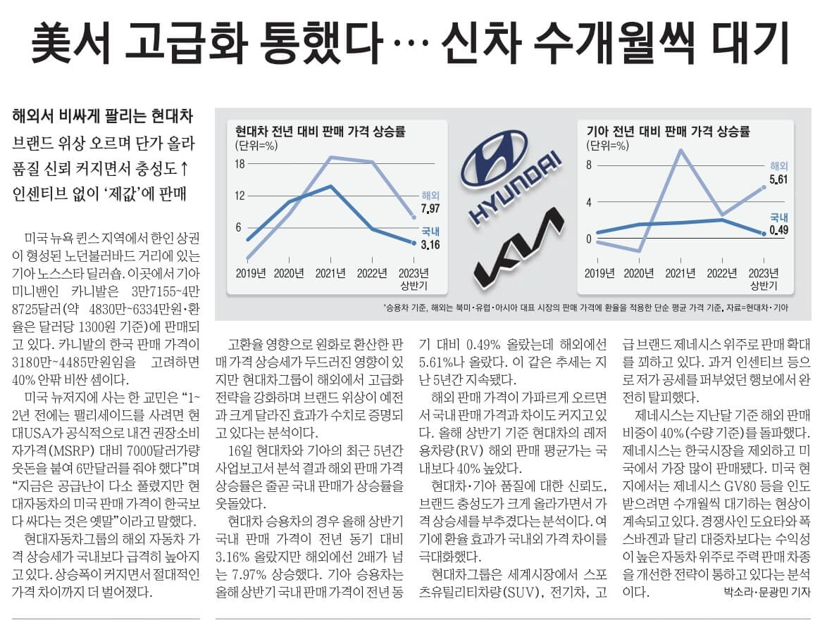 2. 현대차, 기아의 글로벌 브랜드 파워가 커지면서 미국을 비롯한 해외시장에서 판매되는 주력 차종의 가격이 가파르게 상승하고 있는 것으로 나타났음. 매일경제가 최근 5년간 현대차 사업보고서에 공시된 국내외 자동차 판매 평균 가격을 분석한 결과 현대차의 올해 상반기 기준 해외 승용차 판매가 상승률은 전년대비 7.97%를 기록, 국내 판매가 상승률 3.2% 보다 2배 이상 높았음. 국산차의 제값받기가 자리를 잡아가면서 경쟁력 강화로 이어지고 있다는 평가가 나옴.