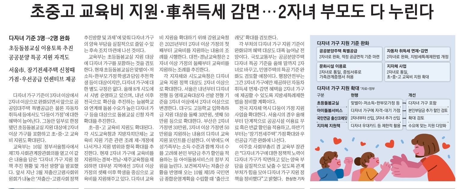 3. 2자녀도 다자녀 혜택, 아파트 특별공급, 車취득세 감면 추진 .. 지금은 18세 미만 자녀가 셋 이상이면 차를 구입할 때 취득세를 면제, 감면받는데 2자녀 가구까지 확대하는 방안을 검토.(동아)