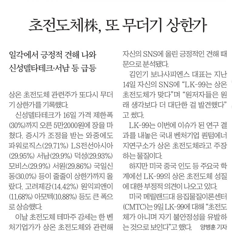 ☞ '투심' 불 붙은 초전도체 관련주 또 무더기 상한가...최근 한국초전도저온학회 LK-99 검증위원회가 조만간 관련 샘플을 확보해 이달 안에 교차 측정에 나설 수 있다고 발표하는가 하면, 지난 14일 국내 학자인 김인기 보나사피엔스 대표가 "LK-99는 상온 초전도체가 맞다"고 힘을 실어주면서, 다시 투심에 긍정적 영향을 준 것으로 풀이된다.
