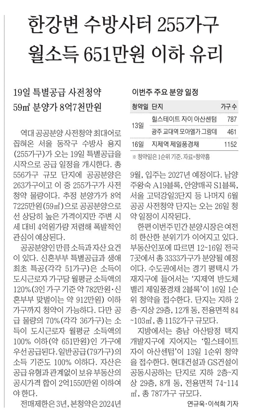 ■한강변 수방사터 255가구 월소득 651만원 이하 유리