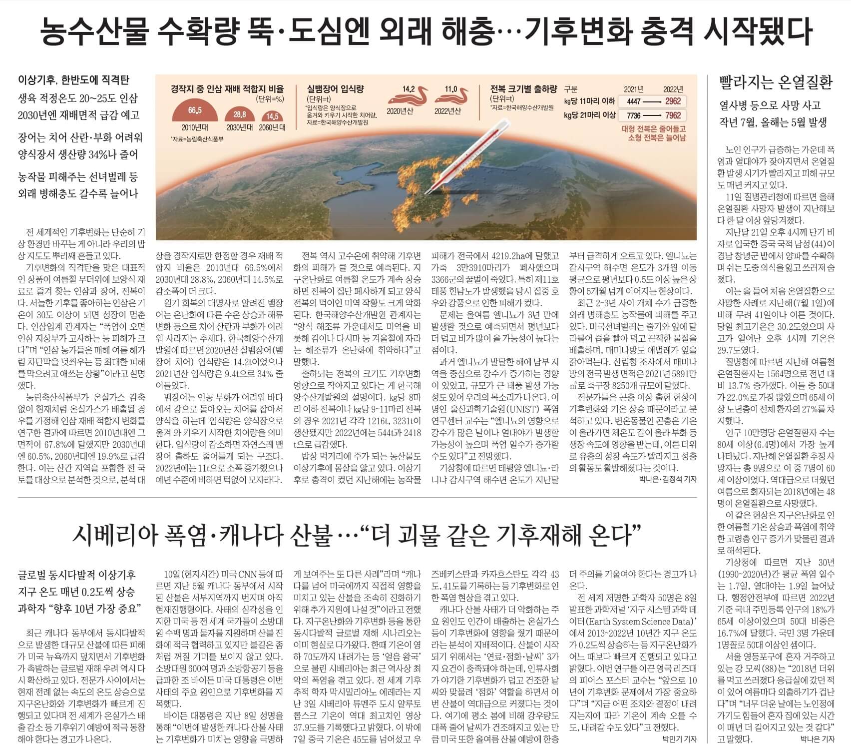 2. 최근 지구촌이 이상기후에 몸살을 앓고 있음. 한반도도 예외가 아님. 11일 매일경제가 기상청 기상자료개방포털시스템을 분석한 결과 한반도의 여름 기온은 지난 30년 동안 평균 2.7도 더 뜨거워졌음. 1993년 전국의 여름 평균최고기온은 26.1도였으나 2022년에는 28.8도로 올랐음. 급속한 온난화로 한반도가 부글부글 끓어오르면서 한국인들의 일상도 빠른 속도로 바뀌고 있음. 여름철 대표 보양식으로 꼽히는 장어 생산량이 줄어들고 인삼 재배면적이 감소하는 등 밥상 지도가 크게 바뀌고 있는 것이 대표적.