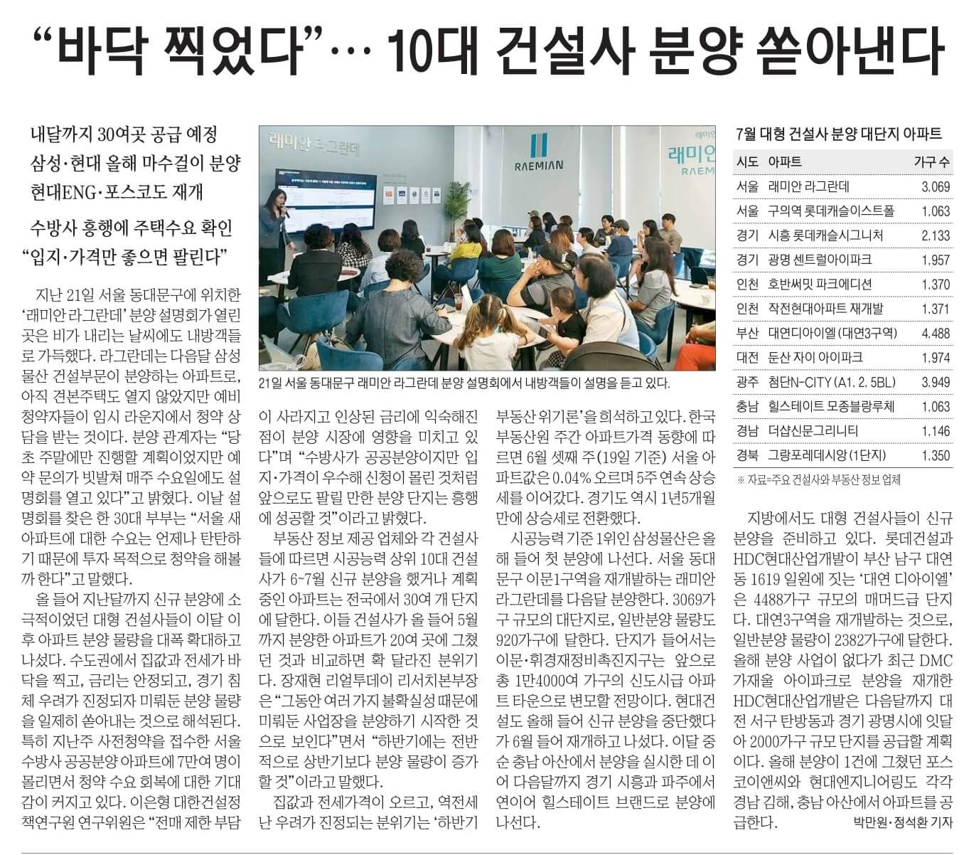 ☞"바닥 찍었다" ... 10대 건설사 분양 쏟아낸다...내달까지 30여곳 공급 예정...삼성 , 현대 올해 마수걸이 분양 현대ENG , 포스코도 재개...수방사 흥행에 주택수요 확인 "입지 , 가격만 좋으면 팔린다"