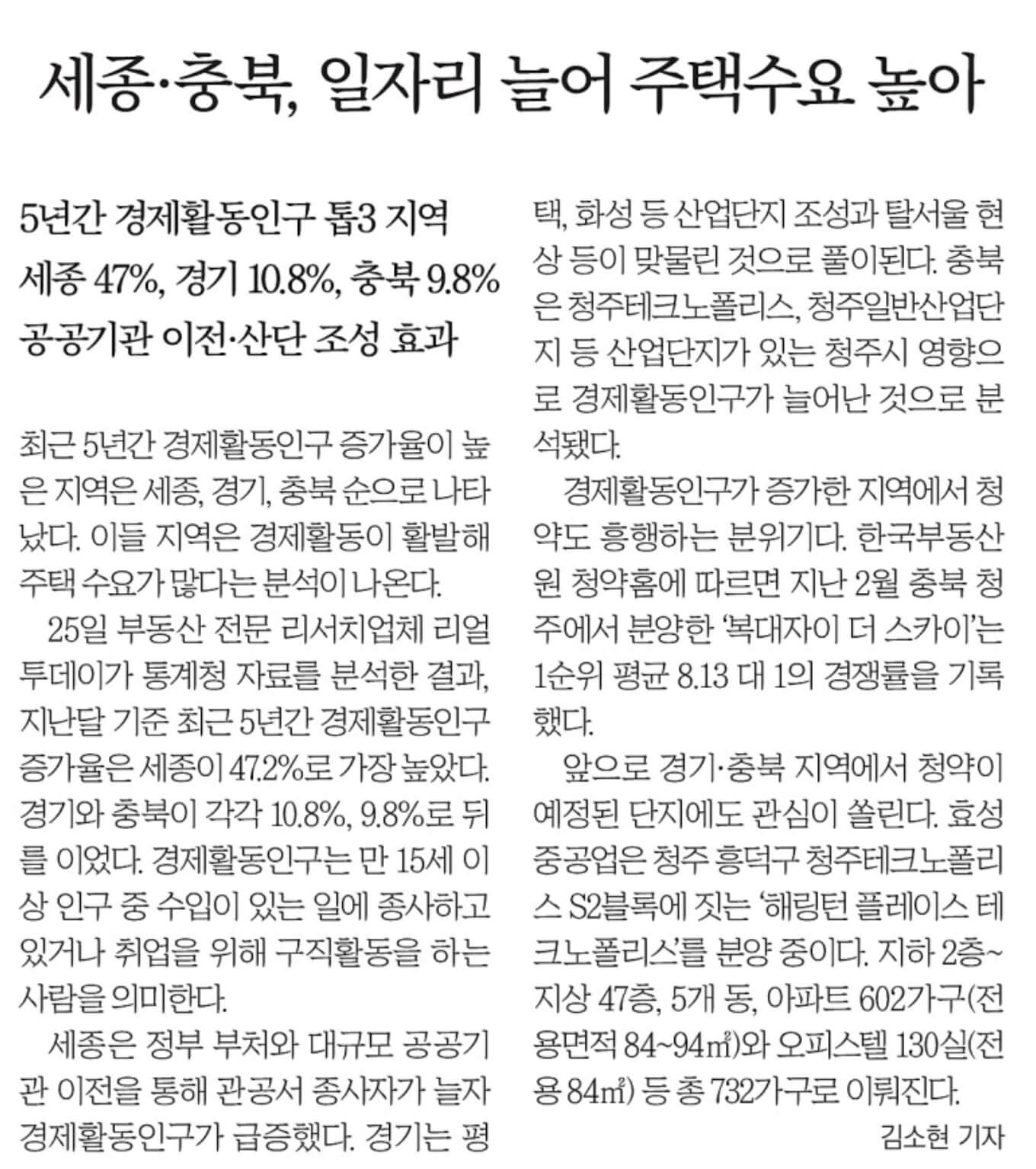 ☞세종·충북, 일자리 늘어 주택수요 높아