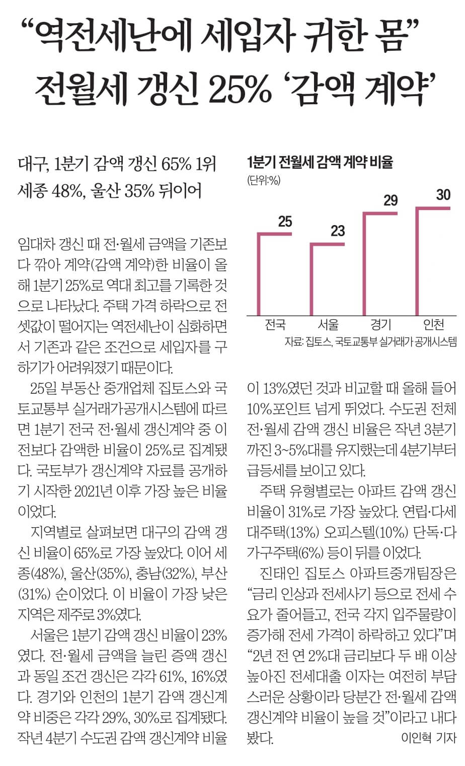☞ "보증금 낮출테니 더 살아주세요"… 전월세 감액갱신 급증...매매가·전세가 동반 하락세...집주인들 보증금 반환 난항...대구 감액 갱신비율 65% 최다