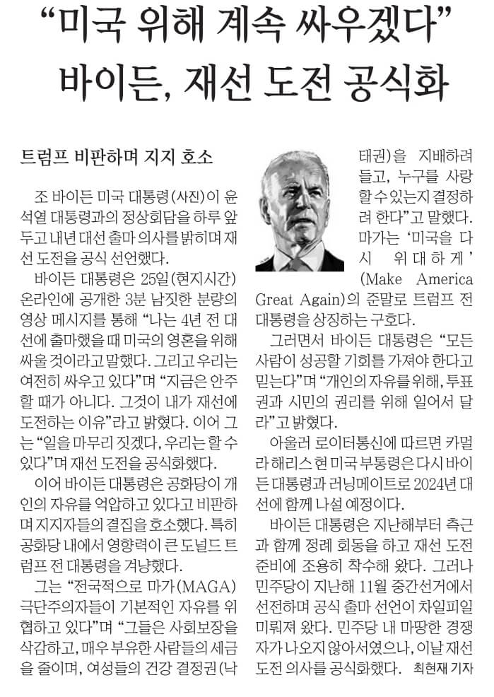 만 80세인 조 바이든 미국 대통령이 내년 대선 출마를 공식 선언했다. 만약 도널드 트럼프 전 대통령이 공화당 대선후보로 확정되면, 두 사람은 2020년 대선에 이어 민주당과 공화당 후보로 다시 대결하게 된다.