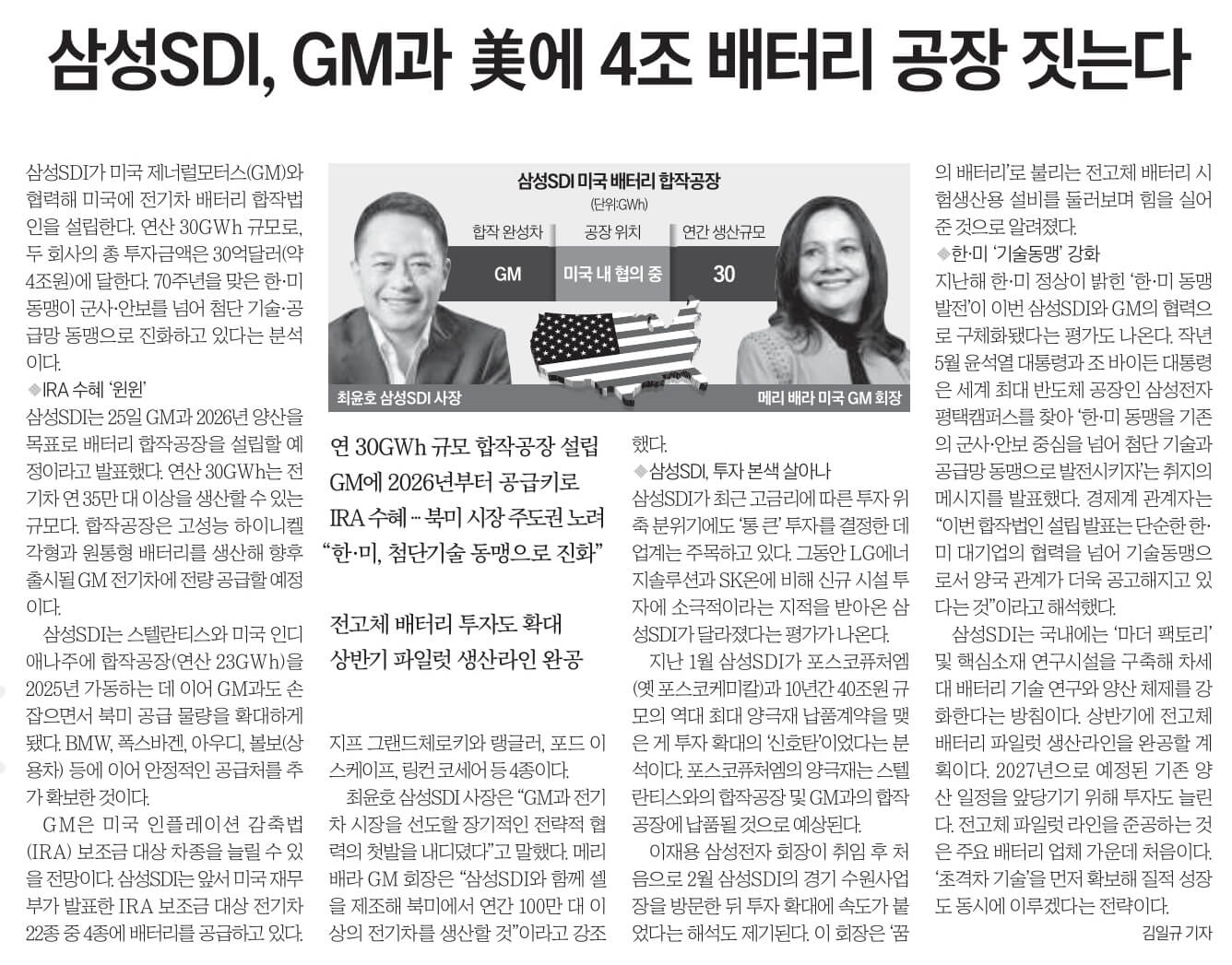 ☞삼성SDI, GM과 미국에 배터리 공장 세운다