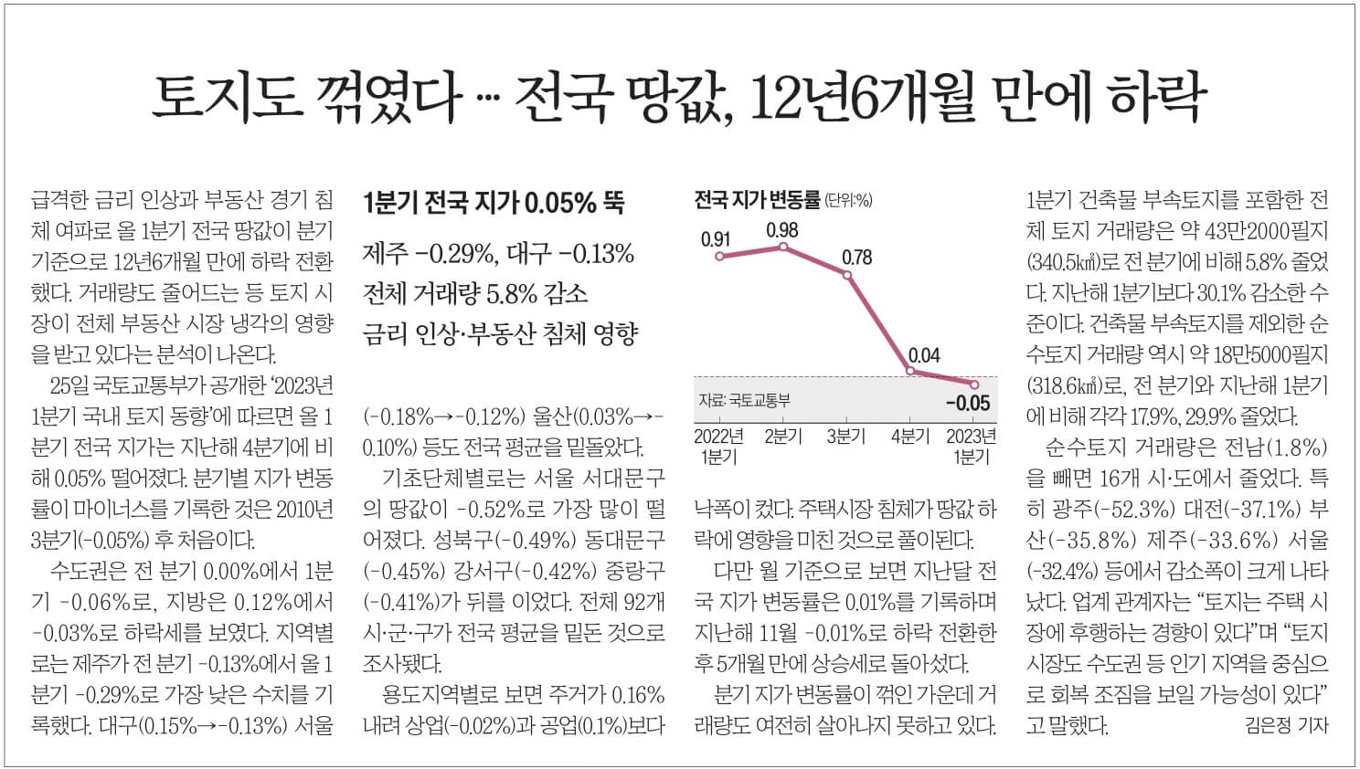 ☞부동산 침체 여파에…전국 땅값 12년만 하락 전환, 거래량도 30% 감소