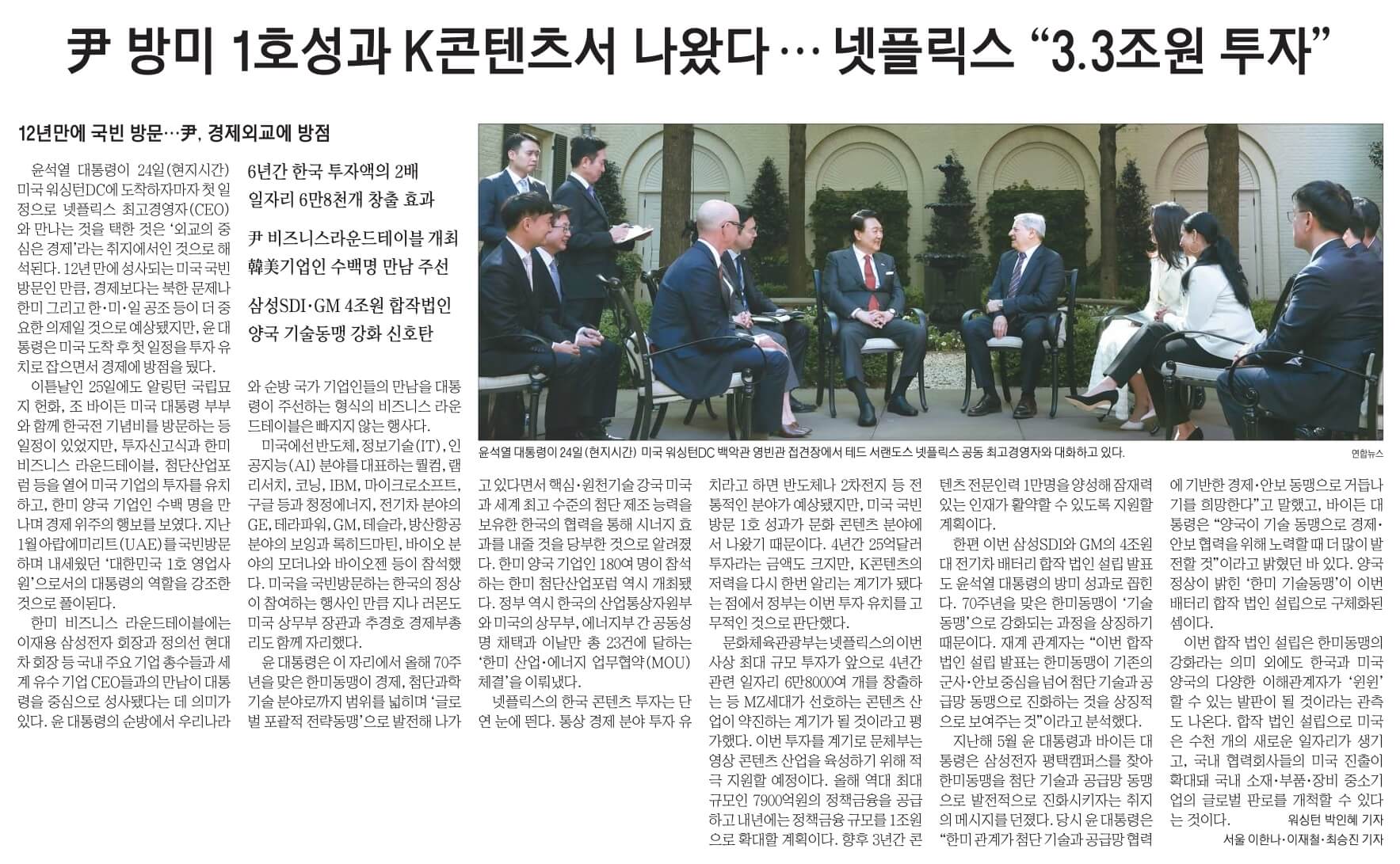 1. 윤석열 대통령이 24일(현지시간) 미국 국빈방문 첫 일정으로 태드 서랜도스 넷플릭스 공동 대표(CEO)를 만나 한국 문화 콘텐츠 산업에 25억달러 규모의 투자를 유치했음. 윤 대통령은 이날 오후 2시쯤 워싱턴DC에 도착한 후 곧바로 미국 백악관 잭슨플레이스에서 서랜도스 CEO와 만났음. 윤 대통령은 “넷플릭스가 앞으로 4년간 K콘텐츠에 25억달러, 약 3조3000억원을 투자하겠다는 입장을 밝혔다”고 말함.