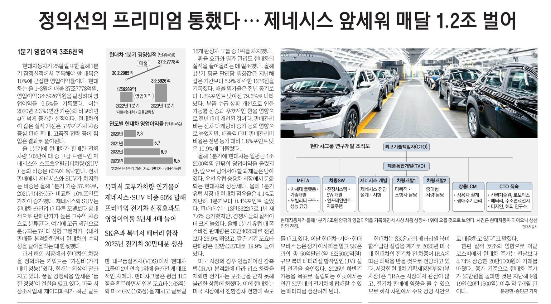 ☞ 정의선의 프리미엄 통했다 … 제네시스 앞세워 매달 1.2조 벌어...1분기 영업이익 3조6천억...북미서 고부가차량 인기몰이...제네시스·SUV 비중 60% 달해...프리미엄 전기차 선점효과도...영업이익률 3년새 4배 늘어...SK온과 북미서 배터리 합작...2025년 전기차 30만대분 생산