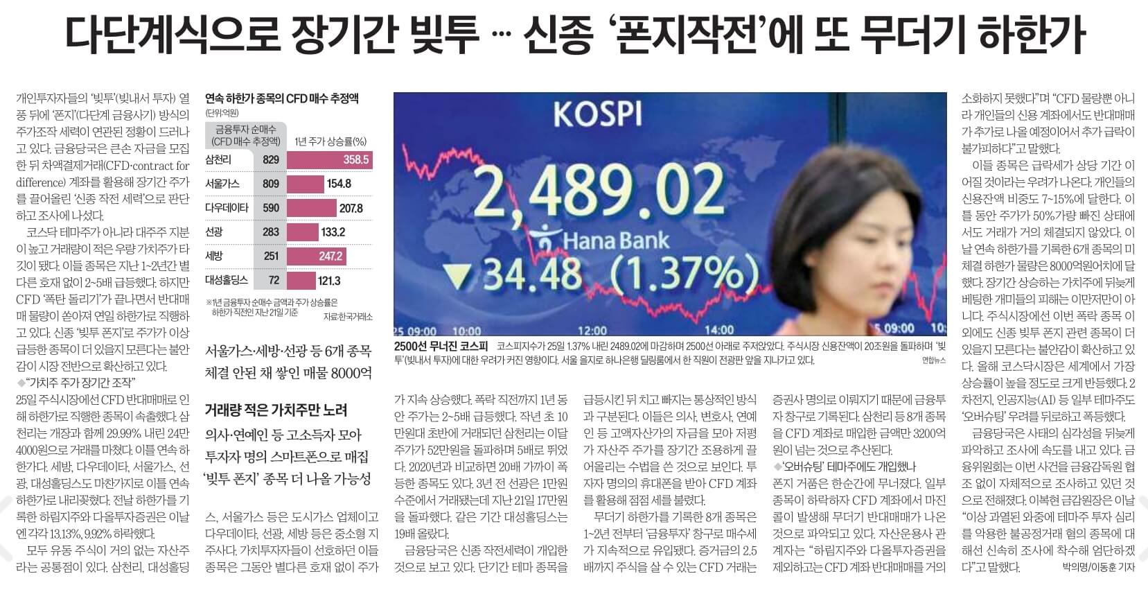 개인투자자들의 ‘빚투’(빚내서 투자) 열풍 뒤에 ‘폰지’(다단계 금융사기) 방식의 주가조작 세력이 연관된 정황이 드러나고 있다. 금융당국은 큰손 자금을 모집한 뒤 차액결제거래(CFD·contract for difference) 계좌를 활용해 장기간 주가를 끌어올린 ‘신종 작전 세력’으로 판단하고 조사에 나섰다.