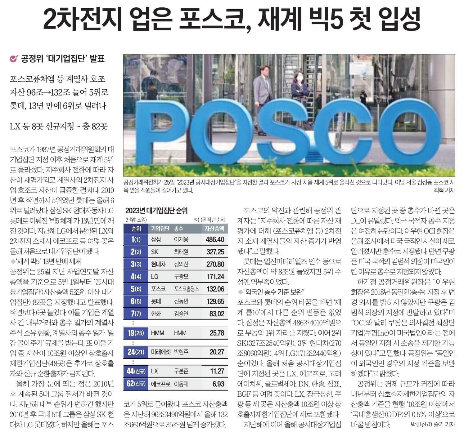 2차전지 소재 기업으로 주목받은 에코프로그룹과 LG그룹에서 분리·독립한 LX그룹이 올해 공시대상기업집단 명단에 새롭게 이름을 올리면서 재계 순위에 파장을 일으켰다.