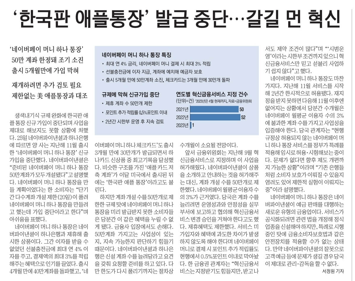 ☞ 규제가 발목 …'한국판 애플통장' 발급 중단...'네이버페이 머니 하나 통장'...50만 계좌 한정돼 조기 소진...출시 5개월만에 가입 막혀...재개하려면 수개월 절차 필요...제한없는 美 애플통장과 대조