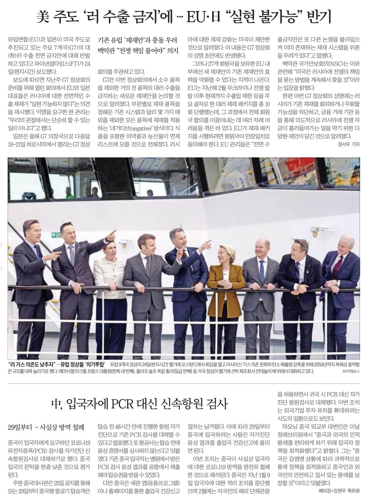 주요 7개국(G7) 차원에서 러시아에 대한 모든 수출을 금지하자는 미국 측 제안에 서방 동맹이 균열하고 있다. 유럽연합(EU)과 일본이 반대하고 있어서다.