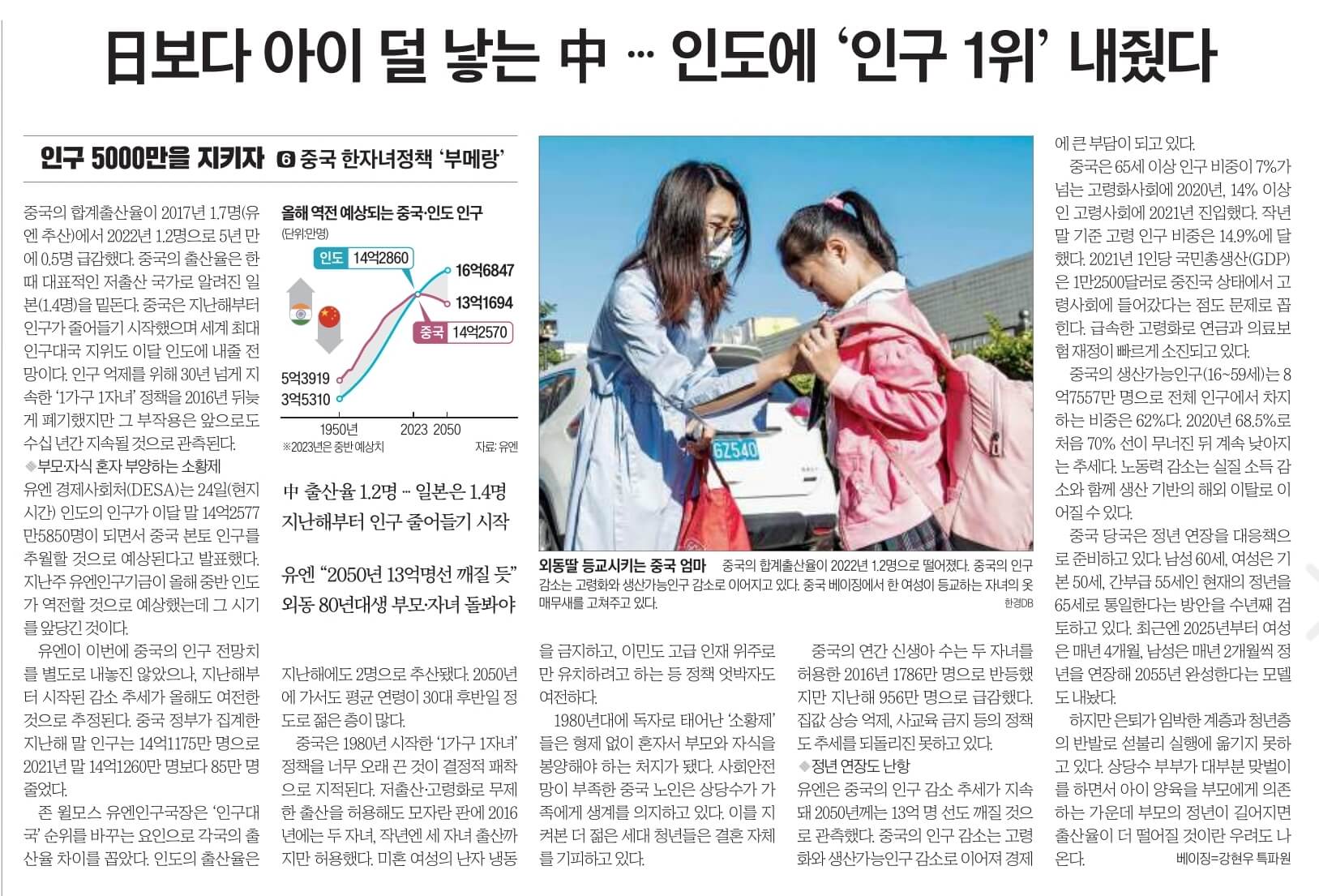 ☞ '인구 1위 국가는 어디?' 상식, 이번 달로 깨진다...이달 말 인도 인구 14억2577만 예측...중국 앞질러…평균 출생률 감소 영향